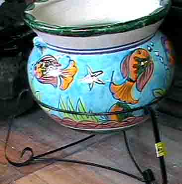 FISH PLANTER (with stand) Dimensions (cm): 35DIAx30h planter47h standFinish: glaze over hand painted clay;heavy iron standCode: 1013000015